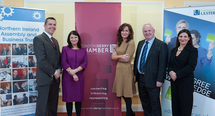 NIABT Procurement seminar at Magee campus, University of Ulster.Left to right:Darren Richardson (Core Consultants), Sinead McLaughlin (Londonderry Chamber of Commerce), Professor Deirdre Heenan (Provost of Magee (Campus) and Dean of Academic Development – Magee), John Gibson (NI Assembly Head of Procurement) and Nora Ann Barron (Pi Communications)